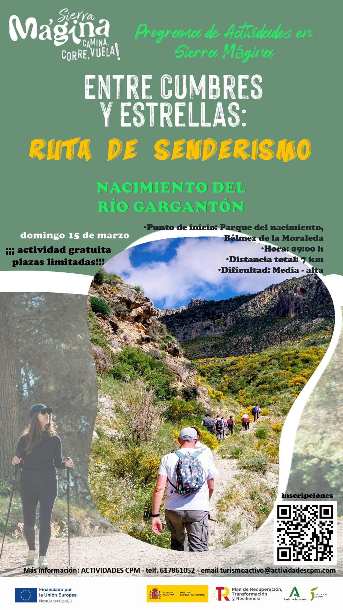 Establecemos el punto de encuentro en el Parque del Nacimiento de Bélmez de la Moraleda, donde posteriormente en los coches particulares nos desplazaremos al punto de inicio de la ruta. El sendero discurre por caminos bien definidos y tramos junto al cauce del río, ofreciendo agradables zonas de sombra y vistas panorámicas del entorno serrano. El principal atractivo de la ruta es el nacimiento del río, un manantial natural donde el agua brota entre las rocas, especialmente espectacular en épocas de lluvia y primavera.